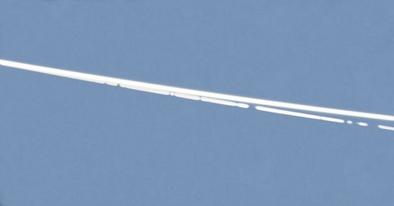 Zum Aufnahmezeitpunkt herrschte Vollmond. Die scheinbare Bahn des Vollmondes läuft nahe des Herbstanfanges fast auf der scheinbaren Sonnenbahn. Kleinbild-Lochkamera, Farbnegativfilm, Filtersystem eigener Konstruktion, digital coloriert. Ca. 40x20 cm. |
