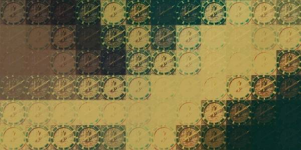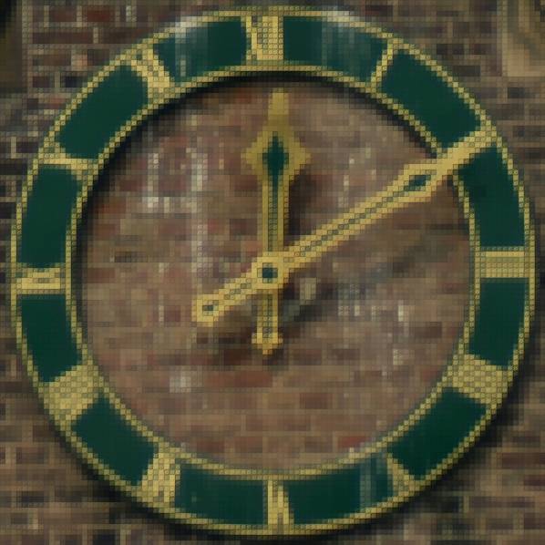 | Nachfolgend sehen Sie ein Detail des Bildes. Es zeigt, dass die Uhr gewissermaßen nur aus sich selbst besteht. Aus der Nähe betrachtet ist nur das linear angeordnete Set kleiner Uhren zu sehen. Das Gesamtmotiv ist erst mit größer werdendem Betrachtungsabstand zu erkennen. Hinweise zur angewandten Technik finden sich hier. |