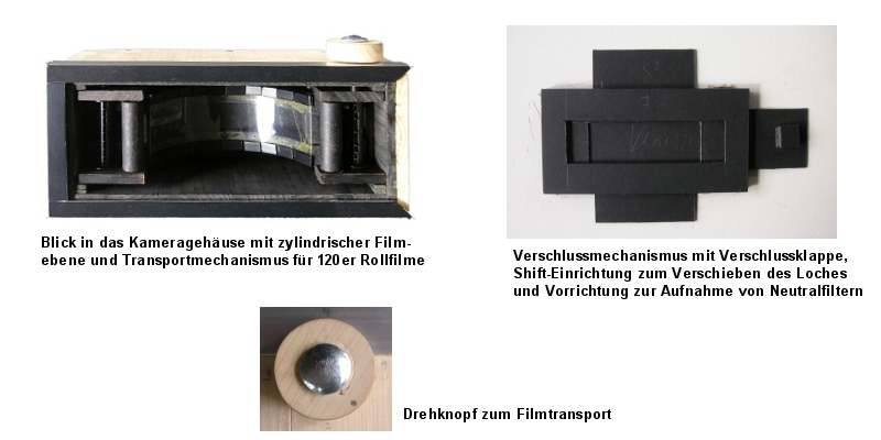 Alternativ kann eine Lochkamera verwendet werden, bei der die Filmebene nicht glatt, sondern zylindrisch ist. Die Vignettierung fällt hier deutlich geringer aus als bei den oben genannten unechten Panoramen. Nachfolgend ist ein selbstgebautes Modell abgebildet, das für die Verwendung von 120er Rollfilm ausgelegt ist. Die Kamera erlaubt nominell einen horizontalen Bildwinkel von 180 Grad. Da jedoch auch hier an den äußersten Rändern Vignettierung auftritt, liegt der praktisch nutzbare horizontale Bildwinkel bei ca. 160 Grad. Erste Aufnahmen mit dieser Kamera finden sich in der Galerie. |