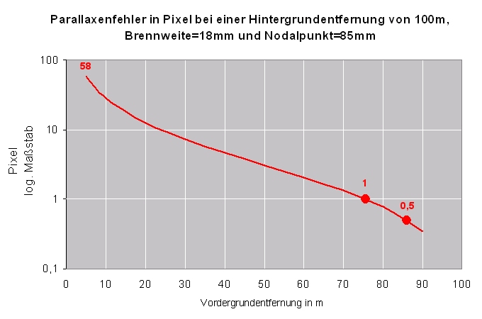 Hier nun eine Illustration des Vorgehens: Angenommen die Hintergrundentfernung (Entfernung des fernsten Objektes im Bild; Objekt 2) sei 100m, die Brennweite des verwendeten Objektivs 18mm, der Nodalpunkt 85mm, so ergibt sich in Abhängigkeit von der Vordergrundentfernung (Entfernung des nahesten Objektes im Bild; Objekt 1) ein Parallaxenfehler, wie er in der nachfolgenden Abbildung dargestellt ist. Beispielsweise beträgt der Parallaxenfehler 58 Pixel (linker Rand der roten Kurve), wenn der Vordergrund nur 5 m entfernt ist. Die beiden roten Punkte markieren die Mindestentfernungen des Vordergrundes bei deren Unterschreitung der Parallaxenfehler höchstens 1 Pixel bzw. höchstens 0,5 Pixel beträgt (Basis ist eine digitale Spiegelreflexkamera mit APS-C-Sensor). |