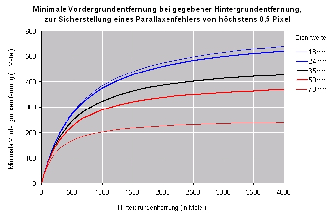 Die Resultate sind in der nachfolgenden Abbildung für verschiedene Brennweiten des dem Beispiel zugrundeliegenden Zoom-Objektivs dargestellt. Beispielsweise zeigt sich, dass bei Verwendung der 18mm-Brennweite die Konstruktion eines Panoramas aus zwei Einzelaufnahmen, die ohne Panoramakopf aufgenommen wurden und Objekte mit einer Entfernung zwischen 538 m (Vordergrundentfernung) und 4000 m (Hintergrundentfernung) praktisch frei von Parallaxefehlern sind (rechtes Ende der oberen Kurve). |
