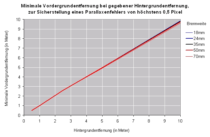 Für den Bereich einer Hintergrundentfernung (maximal entferntes Objekt) von 0,5 bis 4000 Meter wurde untersucht, wie nahe der Vordergrund (Objekt mit minimaler Entfernung) sein darf, damit der Parallaxenfehler kleiner als 0,5 Pixel wird. Ein Fehler dieser Größenordnung dürfte mit hoher Sicherheit keinerlei Probleme beim Stitchen bereiten. Interessiert man sich für ein Panoramamotiv mit Objekten in diesem Entfernungsbereich, kann auf den Einsatz eines Panoramakopfes und damit u.U. auch auf ein Stativ verzichtet werden. |