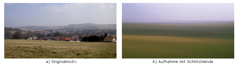 Ob in solchen Aufnahmen noch etwas von dem ursprünglichen Motiv zu erahnen ist, hängt von dessen vertikaler Gliederung ab. Eine typische Landschaftsaufnahme etwa ist im Wesentlichen vertikal gegliedert, etwa: Vordergrund, Horizontlinie, Himmel. Diese Hauptsegmente bleiben bei der Aufnahme mit einer horizontalen Schlitzblende im Wesentlichen erhalten, werden aber äußerst stark reduziert. Am vertikalen Farbaufbau, gefasst in horizontale Farbschichten erkennt der Betrachter das Grundmuster ihm vertrauter Motive. Nachfolgend ist eine Digitalkameraaufnahme einer Lochkameraaufnahme mit Schlitzöffnung gegenüber gestellt. |